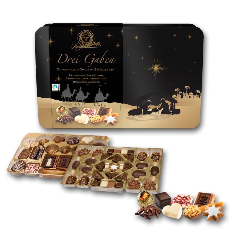 Os Biscoitos Sortidos Três Reis Magos Drei Gaben são cuidadosamente acondicionados em uma prática e bela lata de biscoitos, garantindo a frescura e a integridade de cada unidade. Com um peso líquido de 775g, esta embalagem única é perfeita para quem busca um presente biscoitos sortidos de alta qualidade ou para ter sempre à mão uma variedade de sabores para desfrutar. A embalagem tipo lata também facilita o armazenamento e a conservação dos biscoitos.